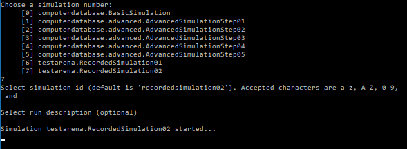 Po wprowadzonych zmianach w skrypcie można uruchomić skrypt z symulacją. Opis uruchamiania skryptu jest w poprzednim artykule Gatling. Przygotowanie środowiska. Część 2. Uruchamiamy Gatlinga i wybieramy numer odpowiadający nagranemu skryptowi, jeśli oczywiście nie popełniliśmy błędu w kodzie i kompilacja skryptu zakończyła się bez błędów. W naszym przypadku będzie to ‘7’ i dajemy ‘Enter’. W kolejnych pytaniach pozostawiamy domyślne wartości wciskając ‘Enter’. W tym momencie symulacja jest uruchamiana, co jest potwierdzone odpowiednim komunikatem.