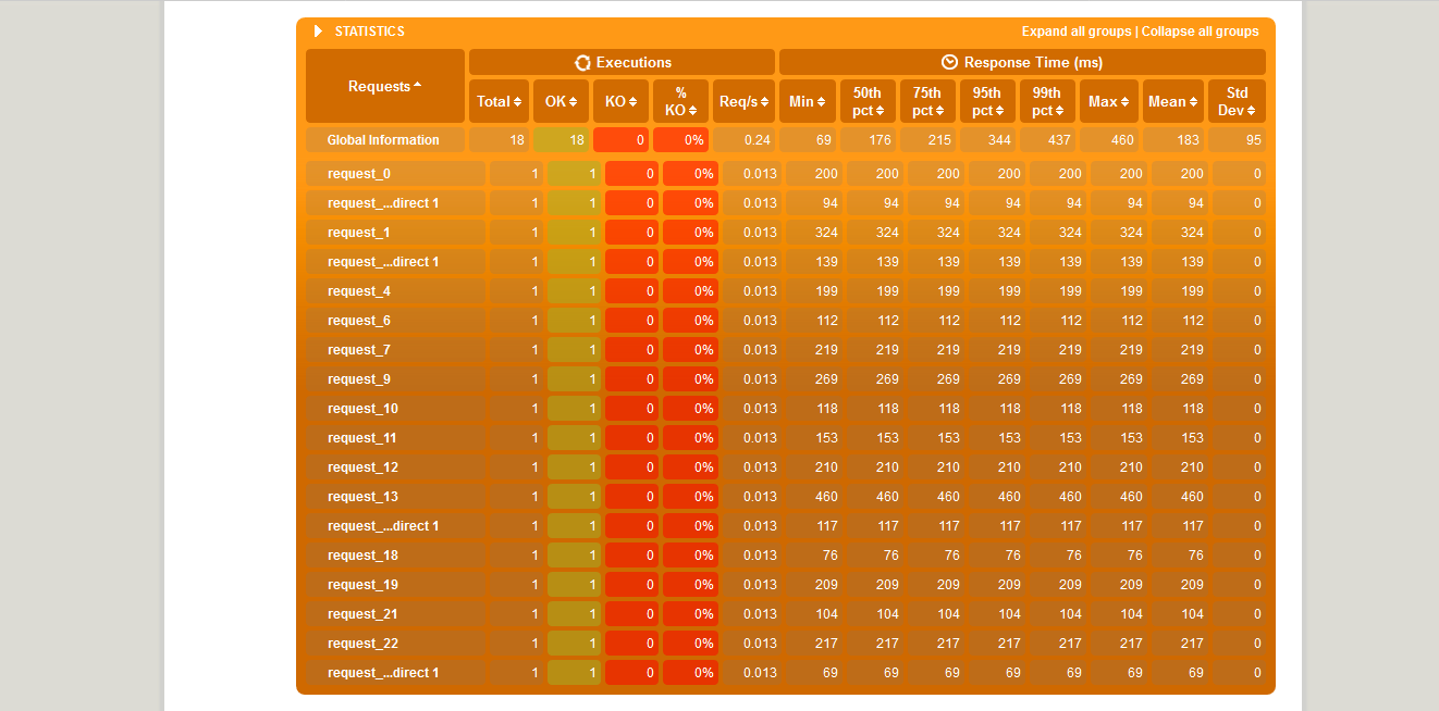Skrypt wykonał się bez błędów, w raporcie także nie widać aby czasy odpowiedzi serwera dla pojedynczych żądań odbiegały od normy. Tak jak w poprzednim artykule raport nie zawiera pełnych danych o wydajności aplikacji, ale poglądowo można zobaczyć jakie dane i wykresy prezentuje m.in. informacje ogólne co do ilości wysłanych zapytań i czasów odpowiedzi, liczba aktywnych użytkowników w czasie symulacji, rozkład czasu odpowiedzi serwera, liczba zapytań na sekundę, liczba odpowiedzi na sekundę. Poniżej na dołączonych zdjęciach prezentowane są tylko informacje ogólne oraz statystyki, widać na nich, że czasy są zgodne z informacjami z konsoli.
