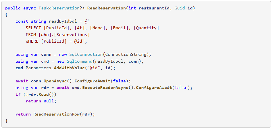W swoim artykule „100% coverage is not that trivial” Mark Seemann opisuje prostą metodę odczytującą rezerwację z SQL-owej bazy danych.