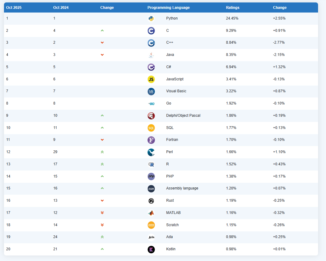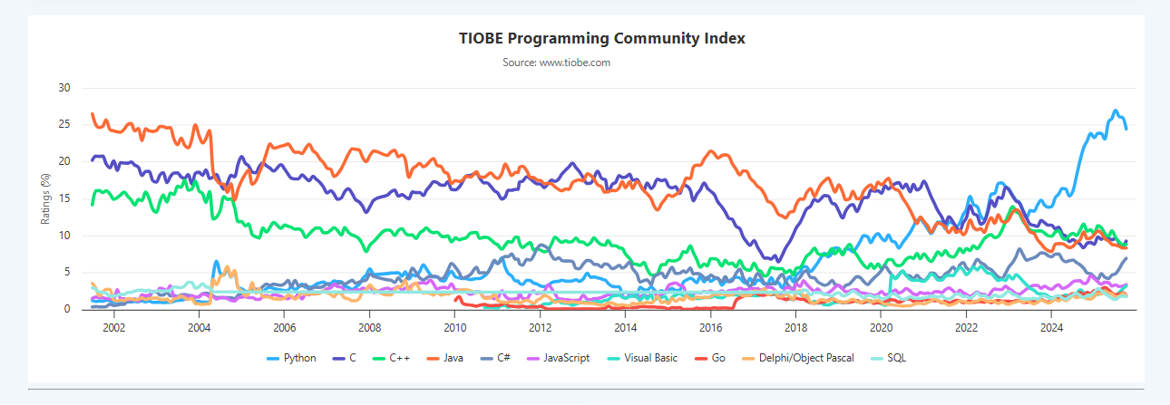 Java i C++ zajmują odpowiednio 4. i 2. miejsce. To oznacza, że nadal są szeroko stosowane, zwłaszcza w środowiskach korporacyjnych, finansowych czy embedded. Dla testerów oznacza to jedno: znajomość testowania aplikacji w Javie (JUnit, TestNG, Selenium) czy podstaw pracy z kodem C++ (szczególnie przy testowaniu integracyjnym lub bezpieczeństwa) wciąż ma wartość, szczególnie w dużych, starszych systemach (legacy).