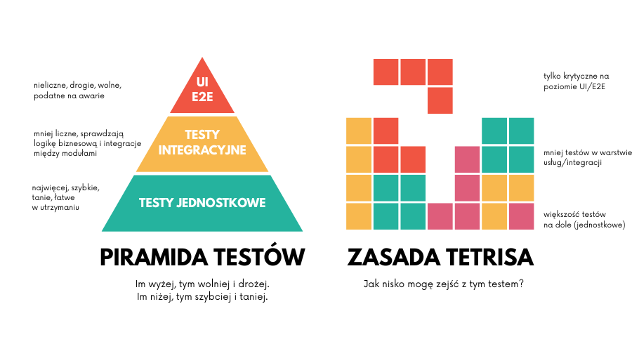 Zasada Tetrisa nie zwalnia z myślenia. Trzeba stosować ją świadomie i nie popaść w automatyzm. Nie każdy test da się sprowadzić do jednostki, więc nie ignoruj potrzeby testów integracyjnych i E2E tam, gdzie są uzasadnione. Pamiętaj, że zbyt agresywne mockowanie potrafi wypaczyć sens testów, a przenoszenie wszystkiego do jednostek bez refleksji może skutkować ignorowaniem realnych problemów integracyjnych.