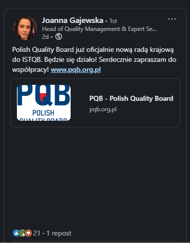 Zmiana ta jest o tyle istotna, że Prezes PQB, Sebastian Małyska, pełni jednocześnie funkcję Sekretarza w światowym zarządzie ISTQB® (Executive Commitee), co dodatkowo zacieśnia współpracę Polski z międzynarodowymi strukturami.